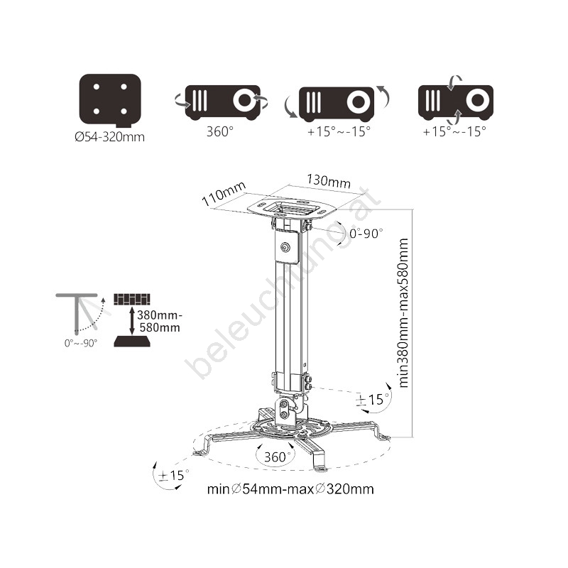 • Höhenverstellbar für optimale Projektion im Bereich von 380 bis 580 mm ab der Decke.