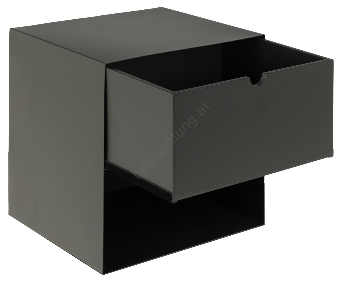 • Oberplatte und Rahmen aus matt schwarzem, grob pulverbeschichtetem Stahl, Schublade schwarz mit offenem Fach und Wandmontage.