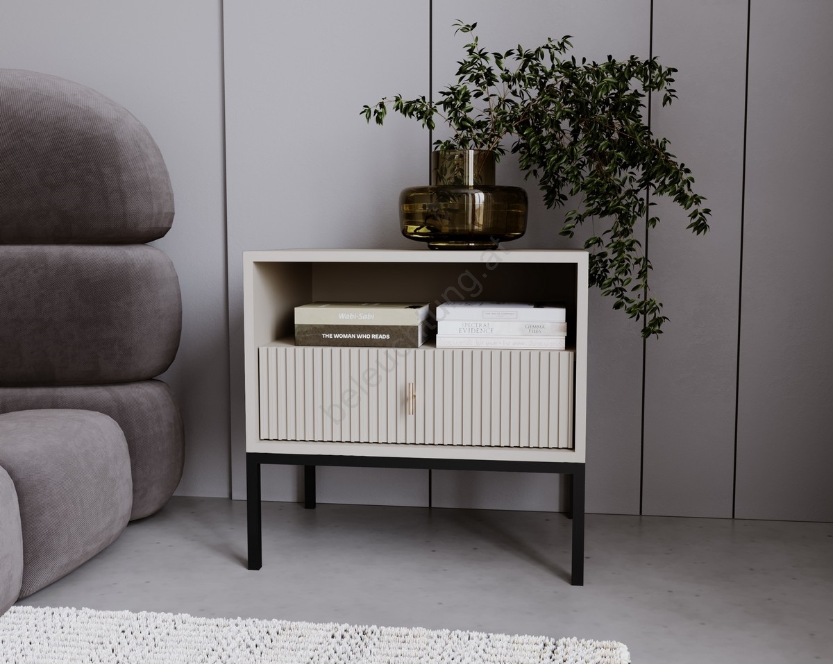 • Er verfügt über eine Schublade mit vertikal geriffelter Front für einen raffinierten visuellen Effekt.