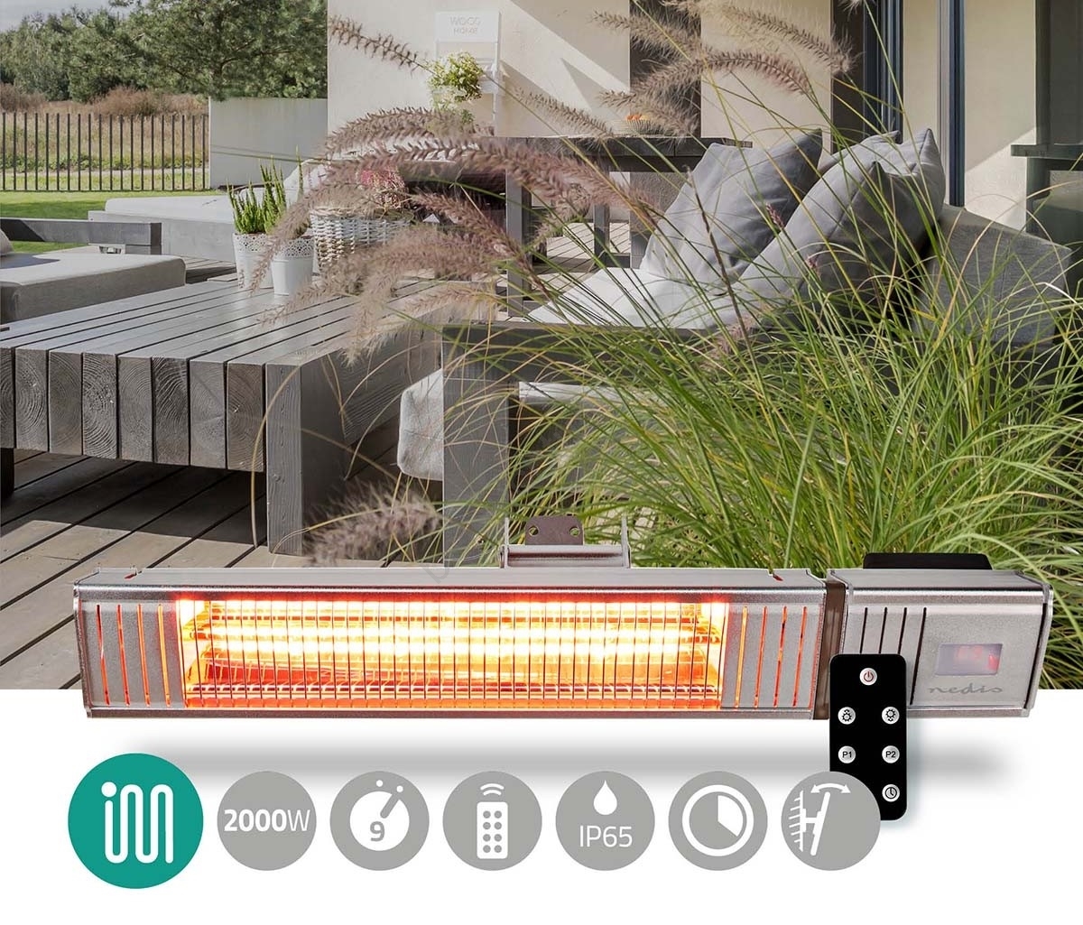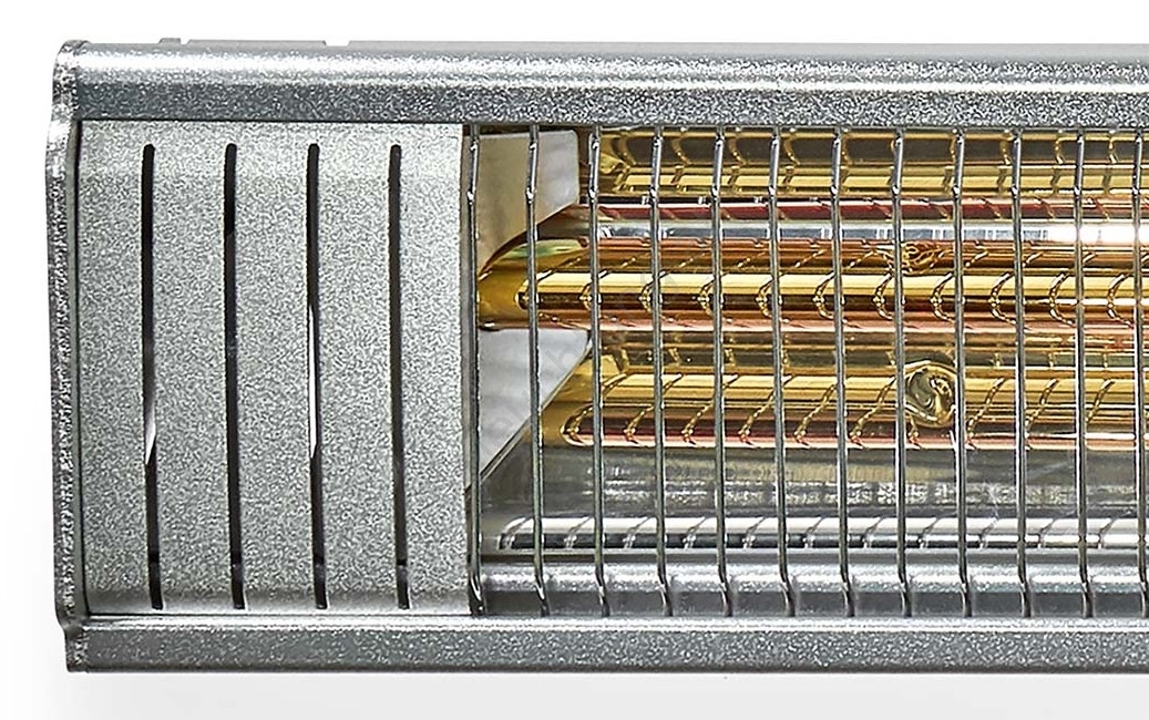 • Wandheizgerät für den Außenbereich, das sehr einfach an einer Außenwand montiert werden kann, enthält Elemente aus goldenen Rohren mit einer maximalen Leistung von 2.000 Watt, wodurch Sie jeden Raum bis zu 20 m2 beheizen können.