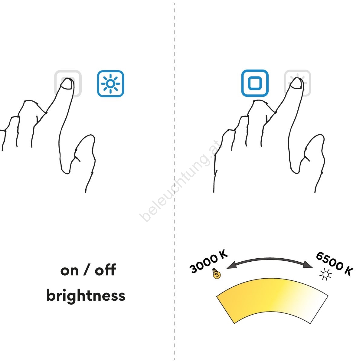 • Der Spiegel verfügt außerdem über eine Speicherfunktion, die die letzte Lichteinstellung sowie die zuletzt gewählte Farbtemperatur speichert.