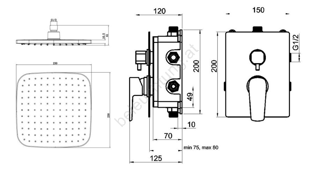 • Lieferumfang: Unterputzarmatur mit Kartusche, 3-stufiger Handbrause, eckiger Wandanschluss mit Halterung für die Handbrause, Metall-Duschschlauch mit Anti-Twist-Schutz, Kopfbrause mit Ausleger.
