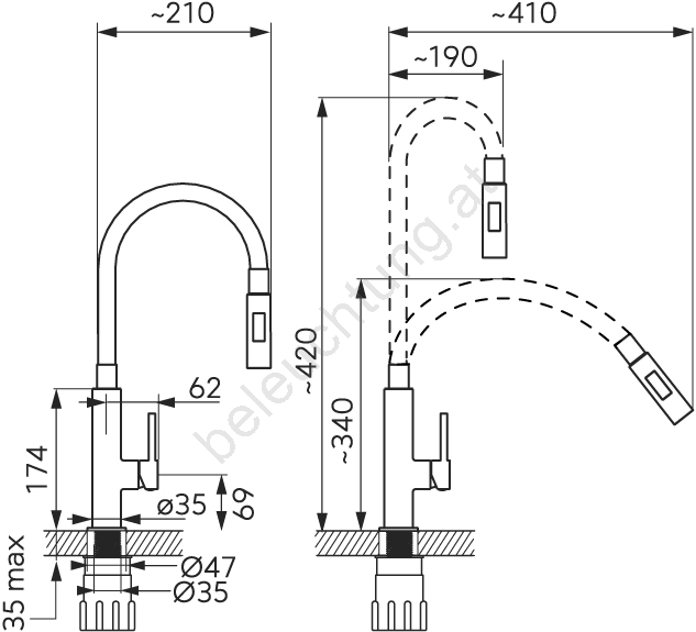 • Der praktische flexible Auslauf erleichtert das Spülen von Geschirr und die Reinigung des gesamten Spülbeckens.