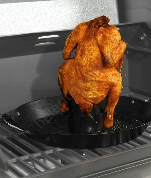 • Das Fett vom gegrillten Hähnchen läuft in die Pfanne ab, es ist jedoch möglich, z. B. Bier oder eine andere Marinade einzufüllen, damit das grillende Hähnchen den Geschmack aufnehmen kann.