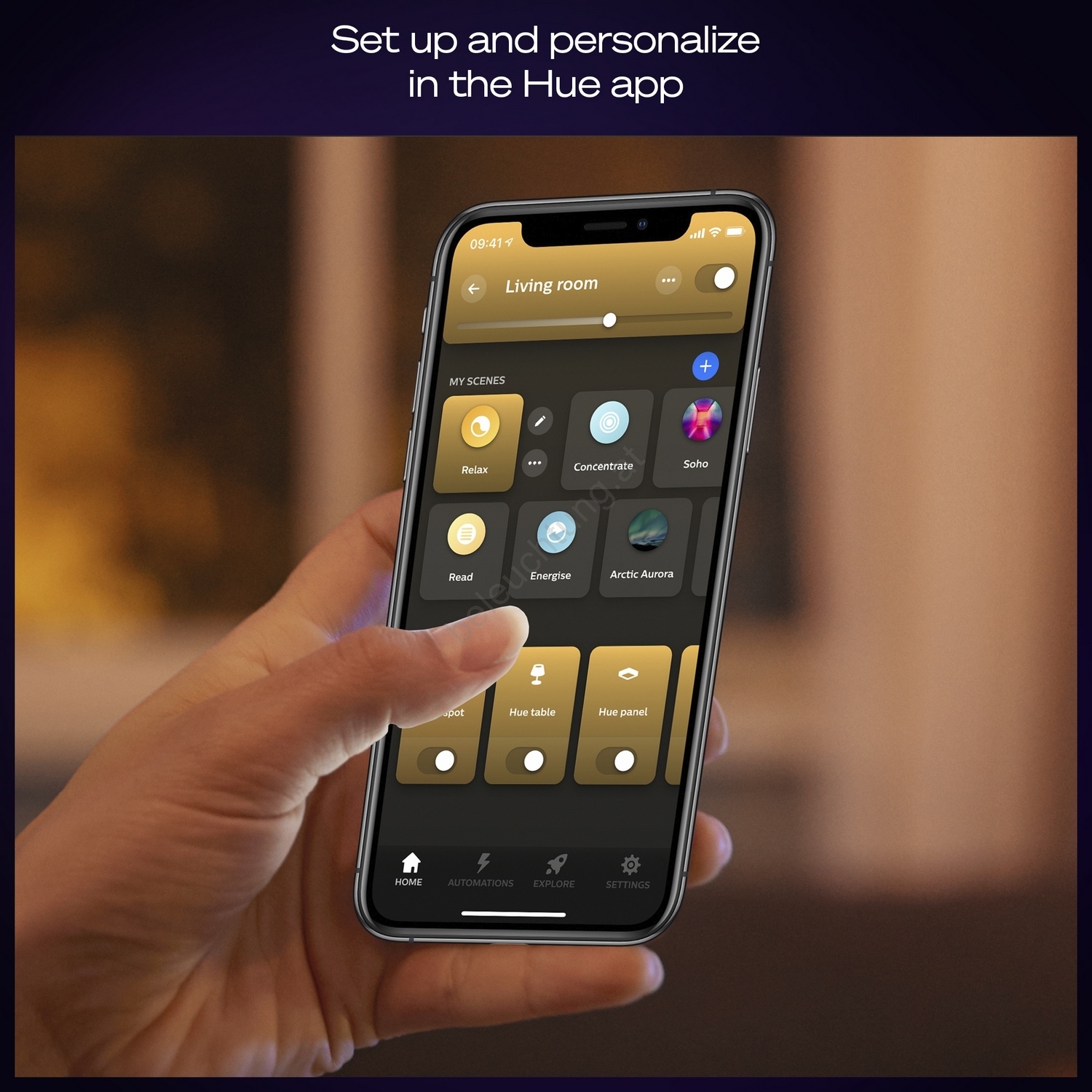 Schaffen Sie die perfekte Atmosphäre mit dimmbaren Philips Hue-Leuchten. Energiesparende Beleuchtung, die sich aus der Ferne steuern lässt und Ihnen hilft, ideale Lichtverhältnisse zu schaffen, die Ihren Vorstellungen, Aktivitäten oder Ihrer Stimmung entsprechen.