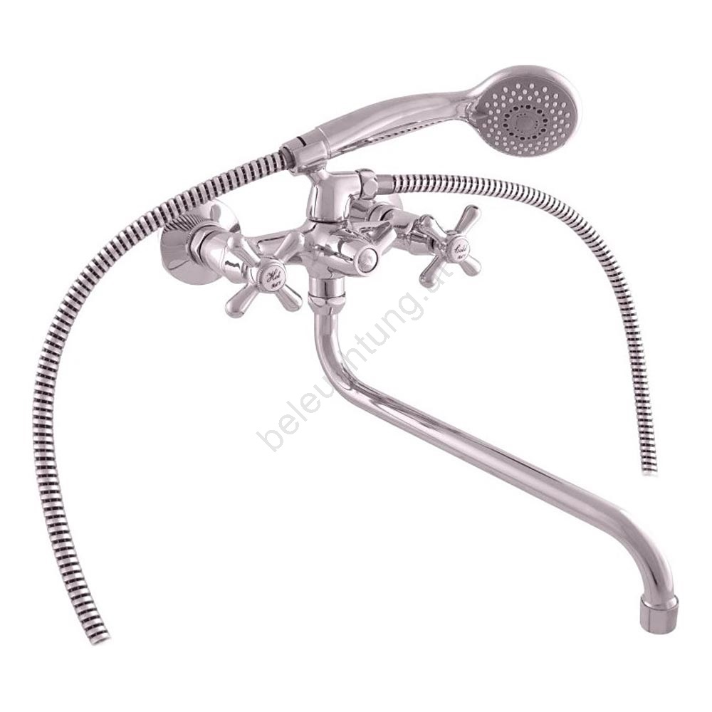 • Badewannen-Set mit wandmontierter Wannenarmatur mit keramischem Umschalter, rundem Auslauf, Handbrause und Brausehalter.