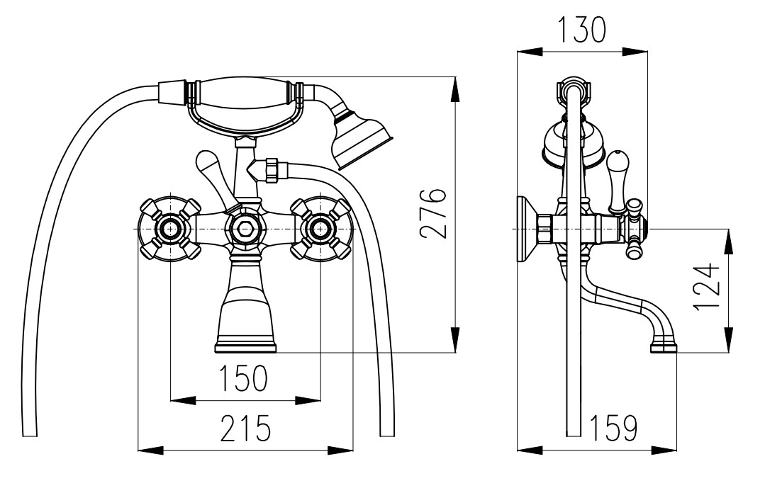 • Wannen-Set mit wandmontierter Wannenarmatur, Gabelhalter zur Ablage der Handbrause und inklusive Handbrause.