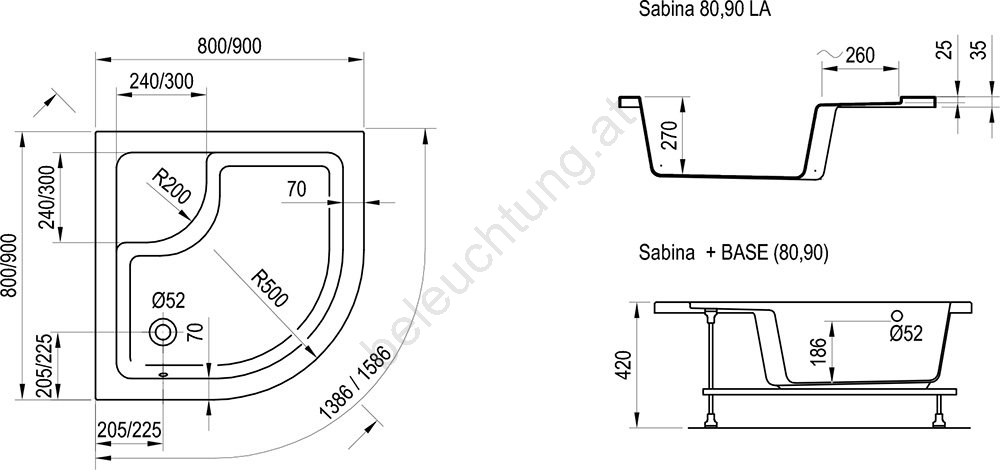 • Viertelkreisige, tiefe Duschwanne Sabina aus Acryl.