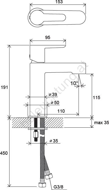 • Die Armatur wird ohne Ablauf geliefert und ist mit flexiblen Anschlussleitungen von 400 mm Länge und dem Anschlussmaß G3/8 ausgestattet.