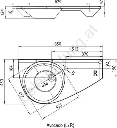 • Die Abmessungen des Waschbeckens betragen 85 x 45 cm, wodurch die Installation auch in schmaleren Bereichen möglich ist, beispielsweise über der Badewanne Avocado.