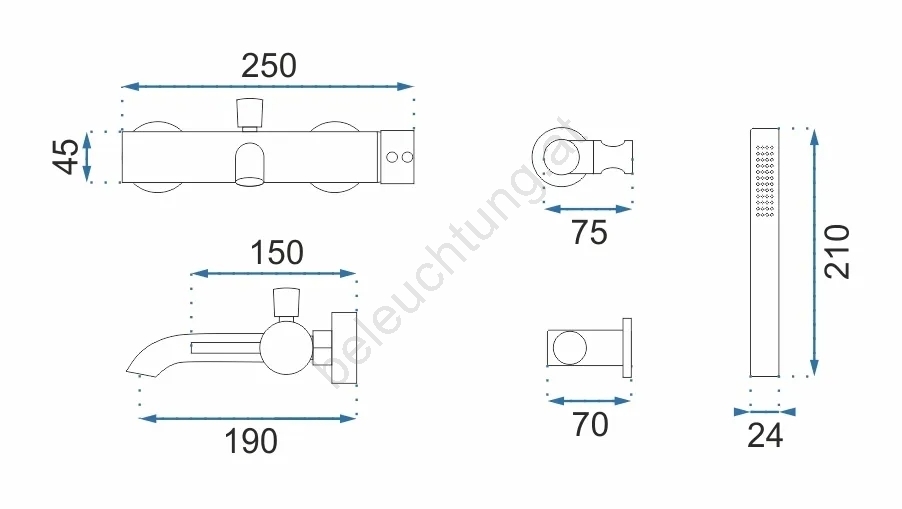 • Das Set enthält: Badewannenarmatur, Handbrause, Duschschlauch (190 mm), Handbrausehalter.