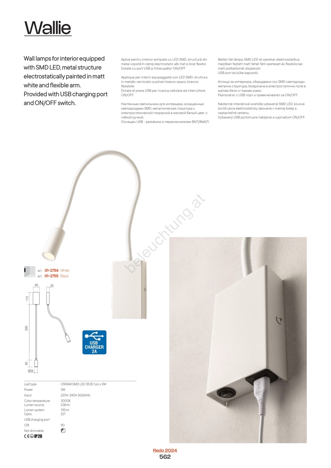 • Redo 01-2754 - LED Flexibles Leselicht WALLIE LED/3W/230V USB CRI 90 Weiß