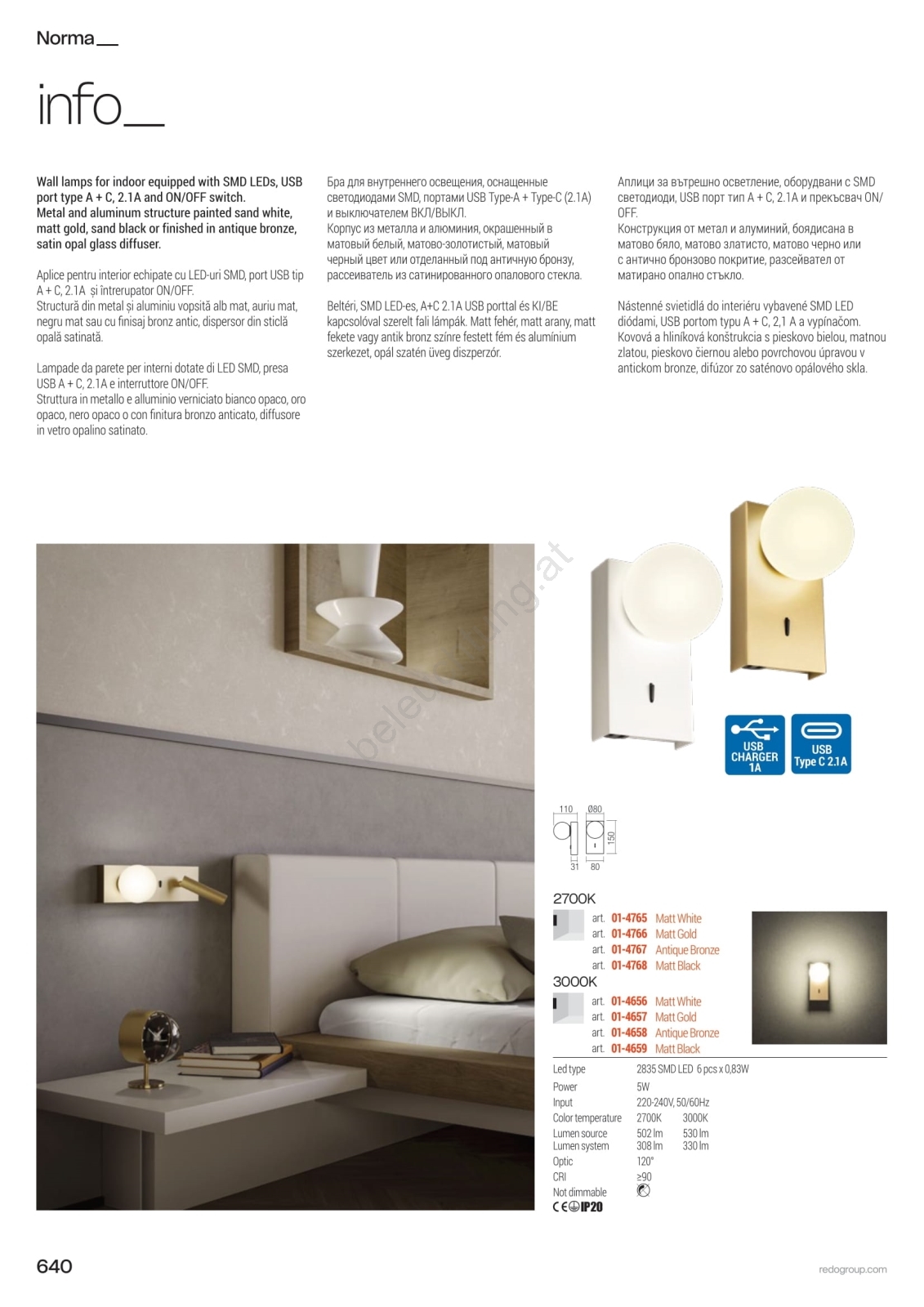 • Redo 01-4661 - LED-Wandleuchte NORMA LED/5W/230V + LED/3W CRI 90 USB weiß/gold