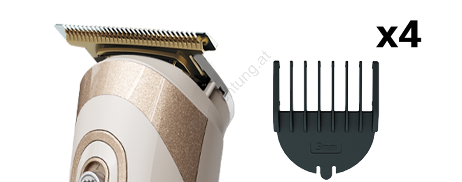 • Einstellbarer Bartaufsatz (3–7 mm) mit 1 mm Abstufung und 4 feste Aufsteckkämme für Haare (3-6-9-12 mm).