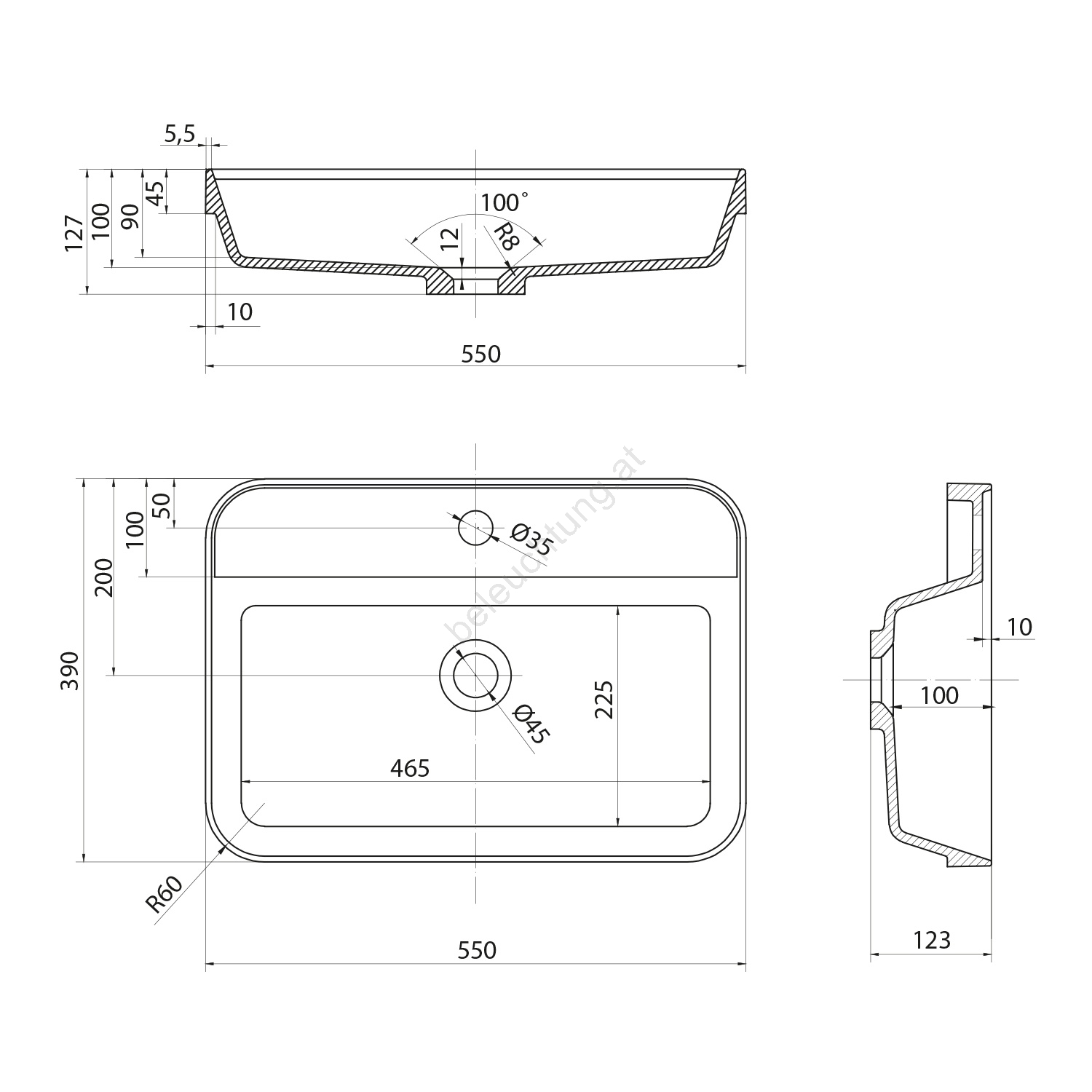 • Die Abmessungen betragen 550x390 mm und die Höhe 123 mm.