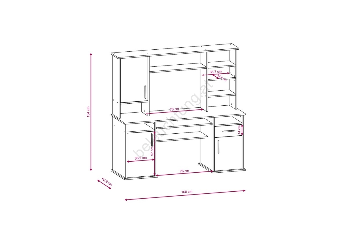 • Er bietet eine großzügige Tischplatte, eine ausziehbare Tastaturschublade und mehrere Stauraummöglichkeiten, darunter geschlossene Schränke, offene Regalböden und vertikale Fächer.