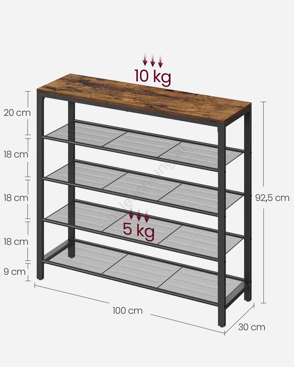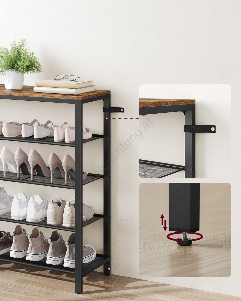 • Mit einer Tragfähigkeit von 10 kg auf der Oberseite und maximal 5 kg pro Ablage können Sie auf diesem Gestell sicher alle Ihre Schuhe, Taschen und Dekoartikel unterbringen.