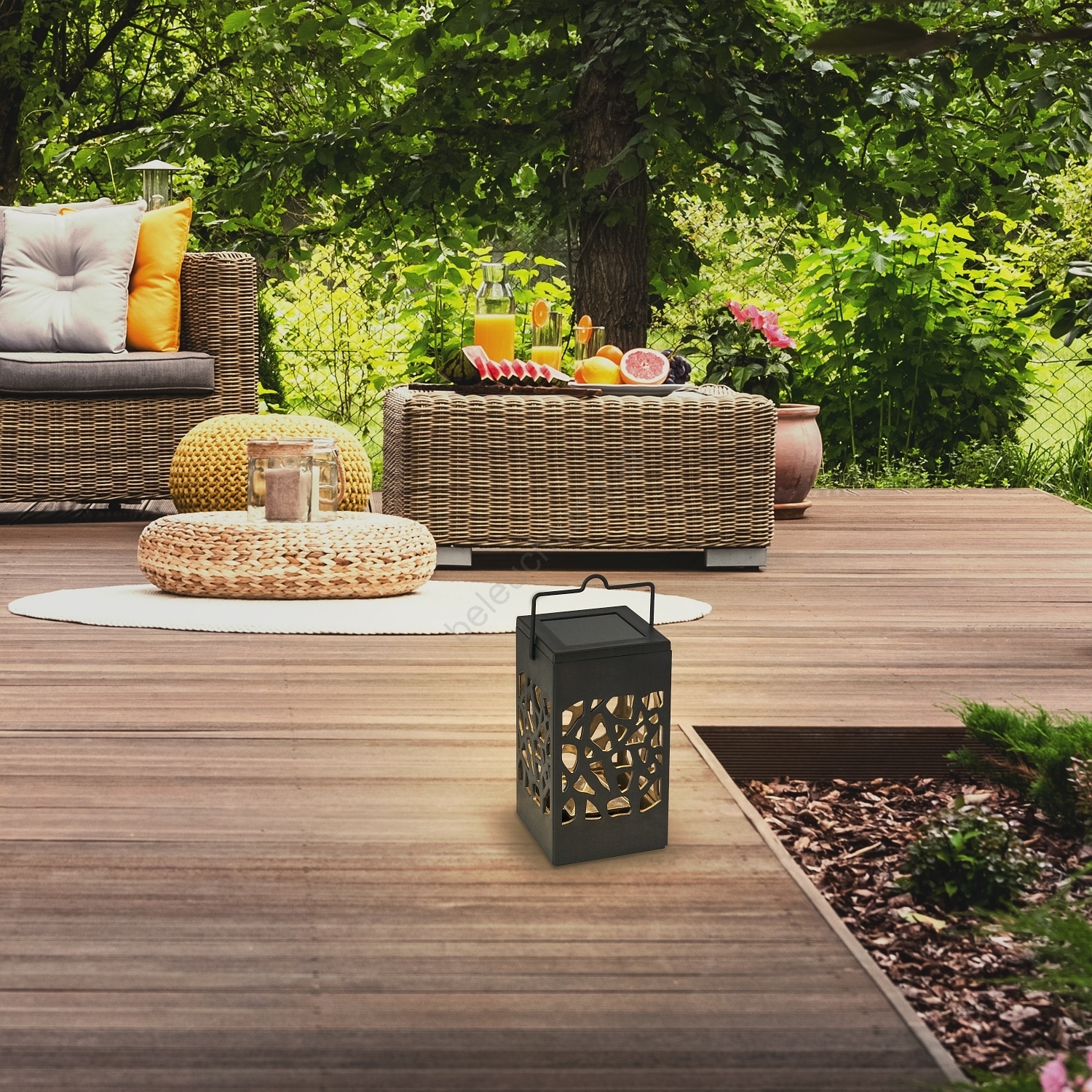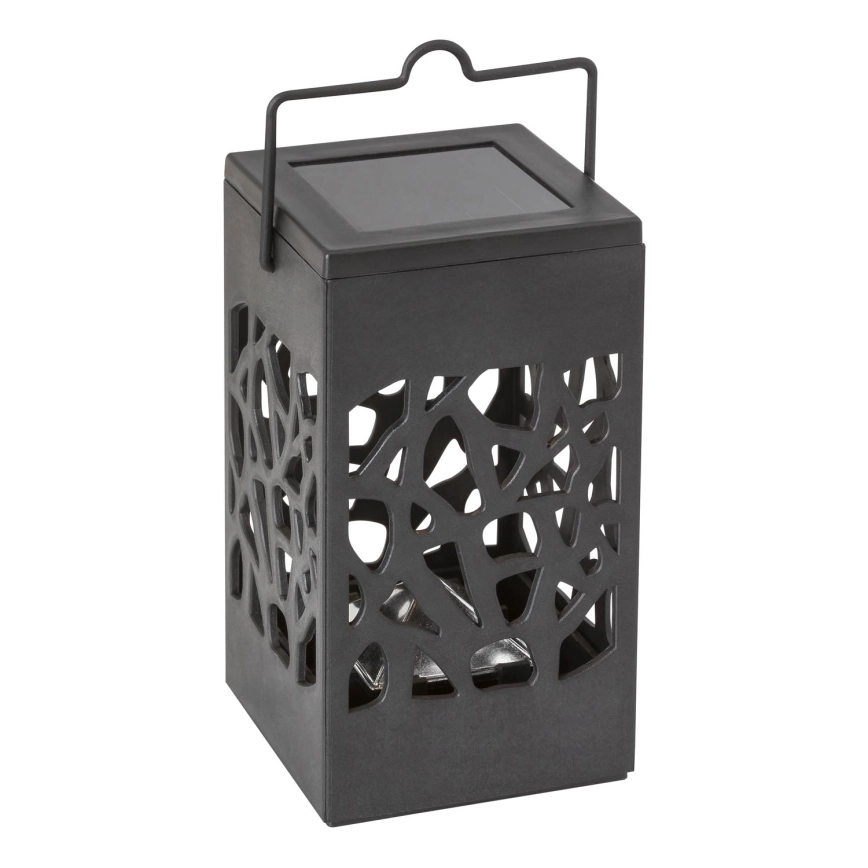 Die Solarleuchte Mora ist eine äußerst gemütliche Ergänzung für Ihre Veranda oder Ihren Garten. Sie können sie auf den Boden stellen, auf einen Tisch legen oder irgendwo aufhängen. Die schwarze, hängende dekorative Leuchte besteht aus Kunststoff und ihre integrierte LED-Lichtquelle erzeugt warmweißes Licht. Die energiesparende Lichtquelle hat eine Leistung von 0,07 W, eine Helligkeit von 1,2 Lumen, eine Farbtemperatur von 3000 K und eine Lebensdauer von 20.000 Stunden. Angaben zu den Solarzellen: AAA NiMH 200 mAh. Die Höhe der quadratischen äußeren dekorativen Leuchte mit den Maßen 60x60 mm beträgt 100 mm. Sie verfügt über die Schutzart IP23, das heißt, sie ist geschützt gegen das Eindringen von Gegenständen mit einem Durchmesser von bis zu 12 mm (z. B. Finger) und gegen das Eindringen von Regenwasser bis zu einem Winkel von 60°.