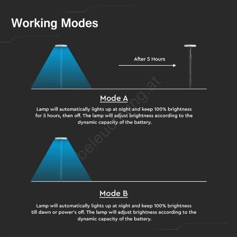 • Modus A – Die Lampe schaltet sich bei Einbruch der Dunkelheit automatisch ein und leuchtet mit 100 % Helligkeit, nach 3 Stunden wird auf 70 % gedimmt und nach weiteren 2 Stunden auf 50 %, mit der sie bis zur vollständigen Entladung oder bis zum Morgengrauen leuchtet.