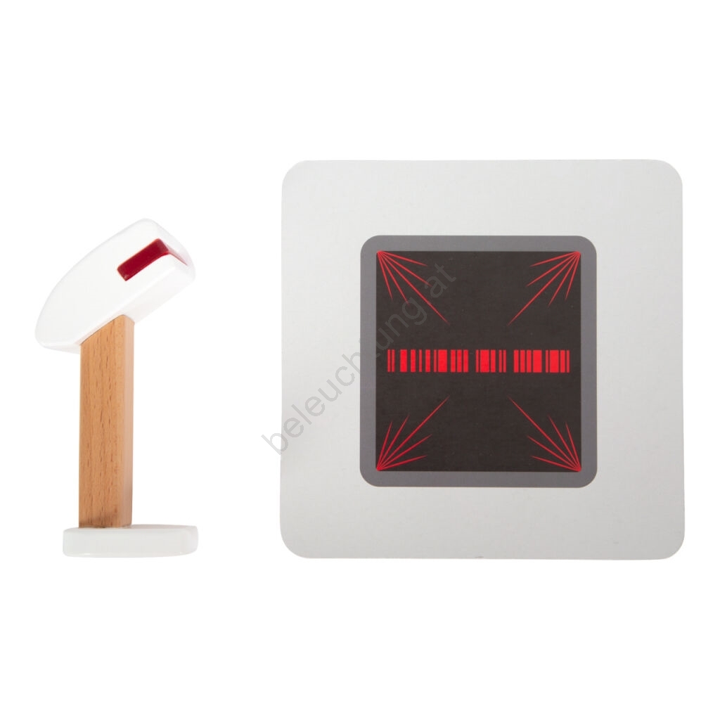 • Im Set enthalten sind ein Barcode-Scanner, eine abreißbare Kassenbonrolle, Monitor, Scanner, Debitkarte, Produktkarten und beidseitige Holzmünzen.