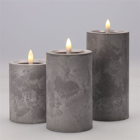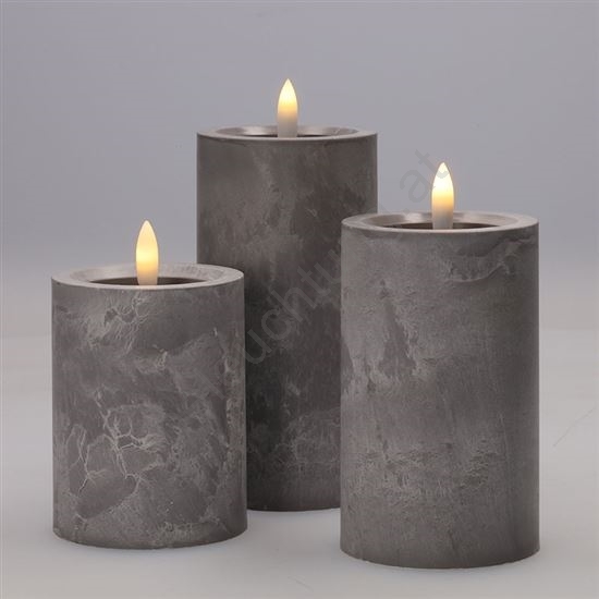 • LED-Kerzen-Set mit natürlich flackernder Flamme und grauem Marmordekor.