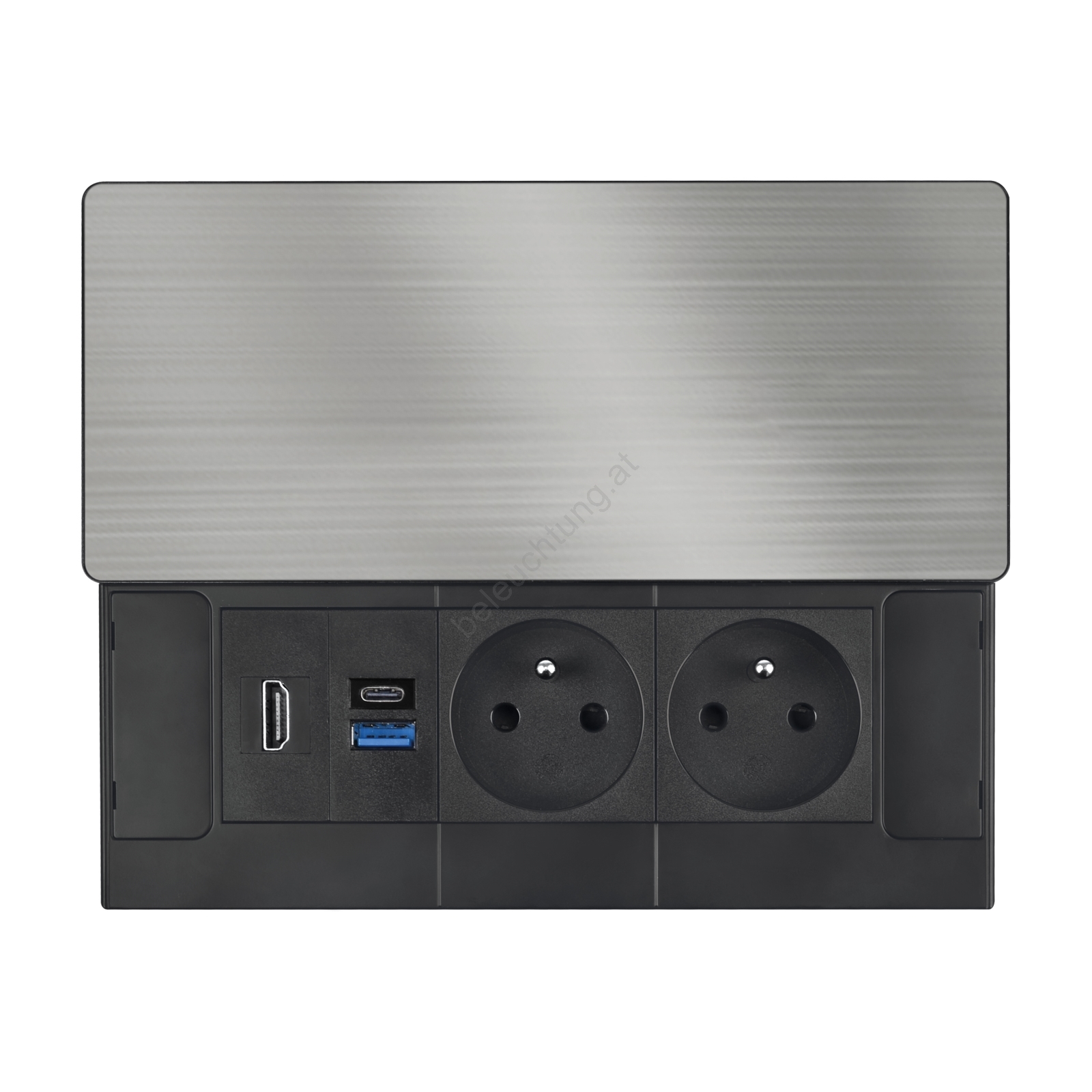 • Die obere Abdeckung besteht aus mattiertem, dunkel gebürstetem Edelstahl und verfügt über einen Schiebemechanismus, der Steckdosen und Anschlüsse vor Staub und Verschmutzung schützt.