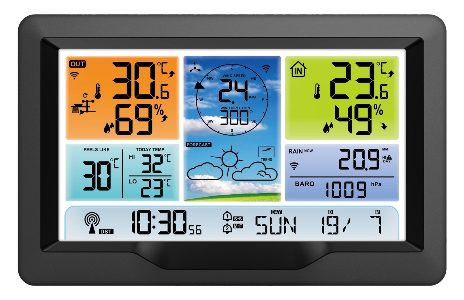 • Professionelle Wetterstation mit Farbdisplay und Wecker.