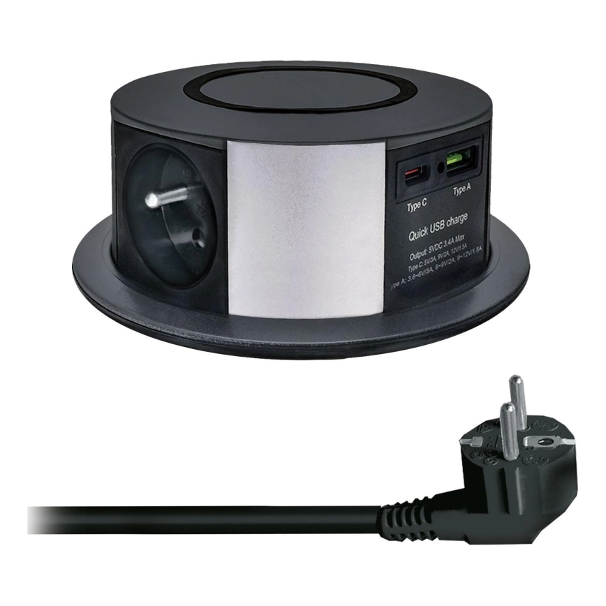 Steckdosensäule für Tischplatte mit kabellosem Qi-Ladegerät 3x230V + 1xUSB-A + 1xUSB-C schwarz/silber