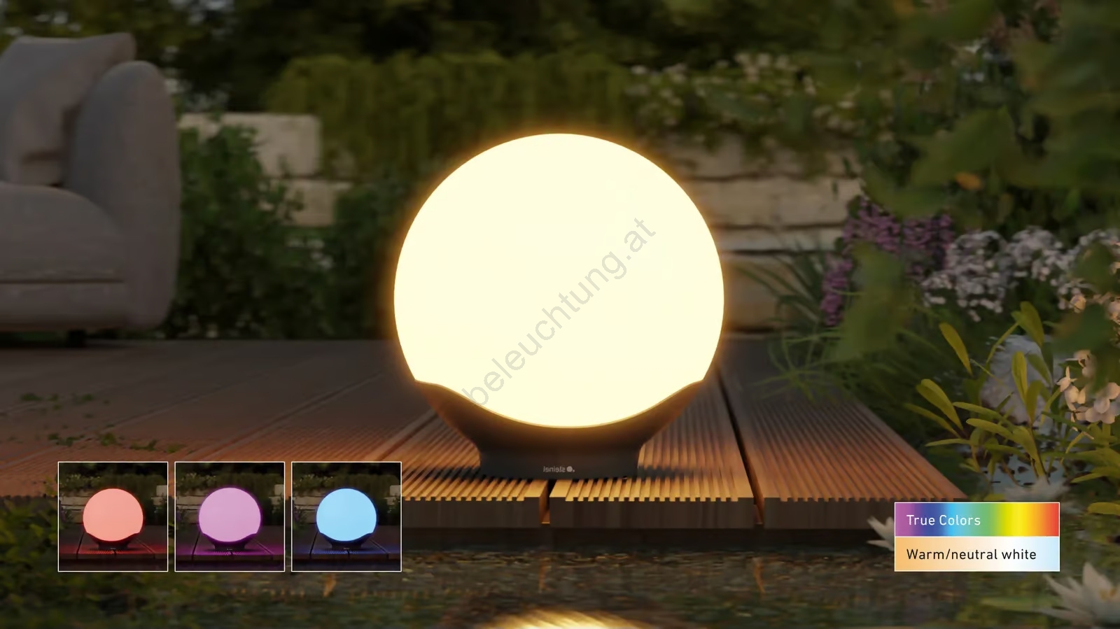 • Moderne 24V Garten-LED-Leuchte (Kugel) mit integriertem Dämmerungssensor.