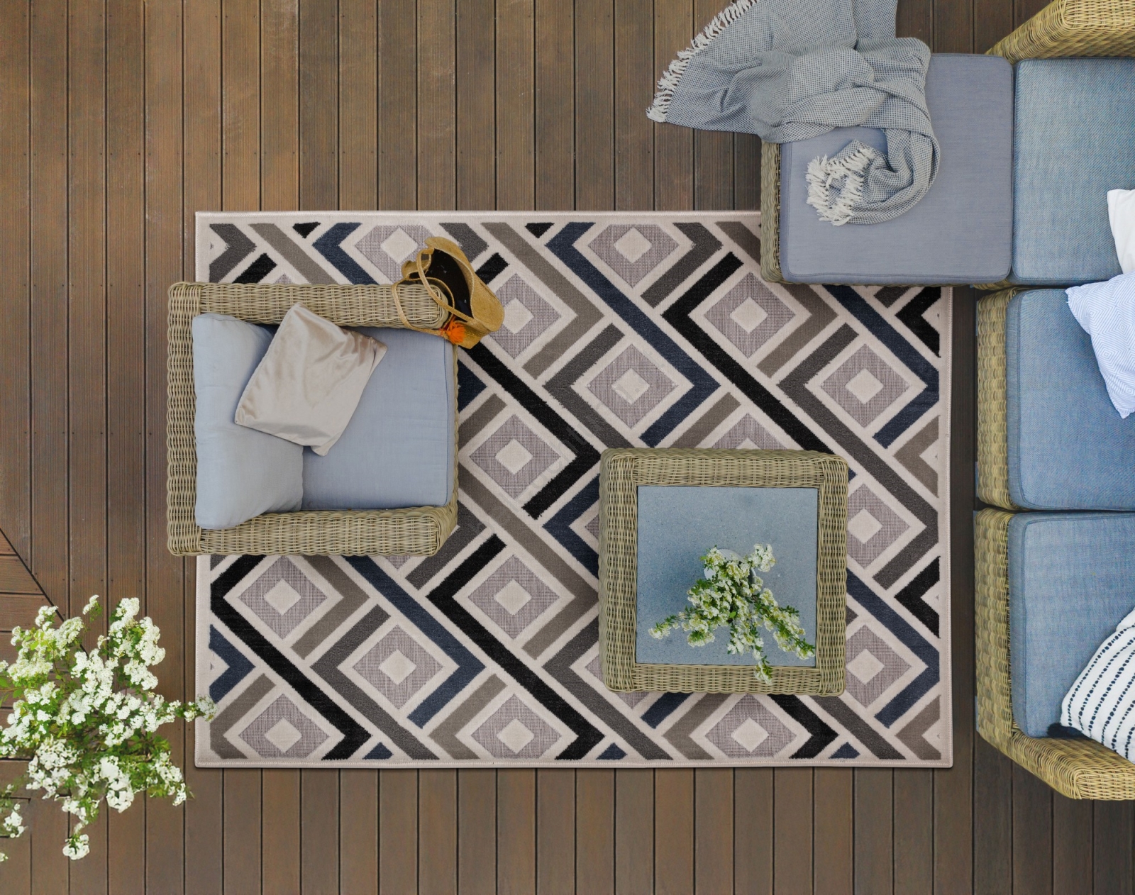 • Stilvoller und eleganter Teppich mit geometrischen Mustern.