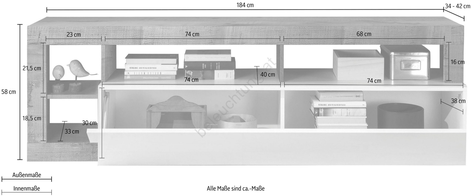 • Unteres Fach und offene Regale bieten Platz für Bücher, Dekorationen und Haushaltsgegenstände.