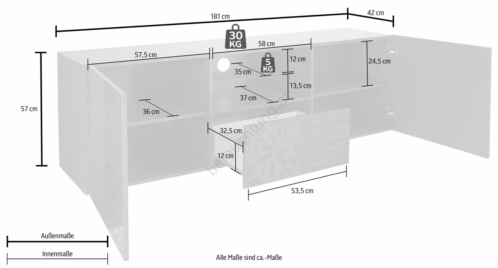 • Fächer, Schublade und Ablagen bieten Platz für Bücher, Dekorationen und Alltagsgegenstände.