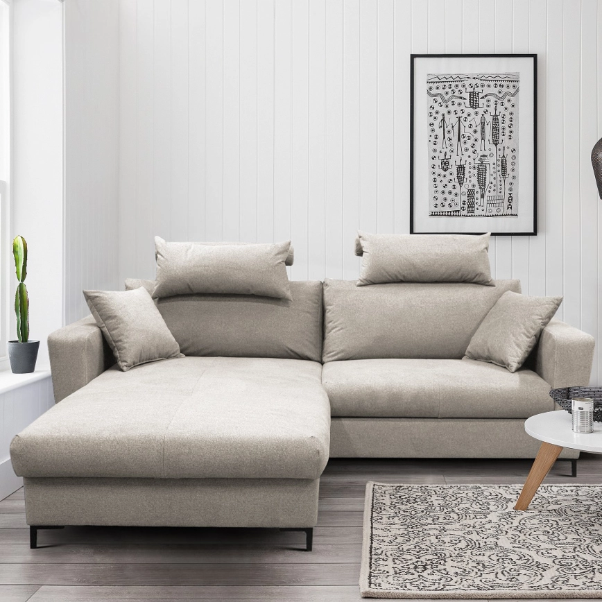 • Ausziehbare, linksseitige Eckgarnitur HORTA in L-Form mit Stauraum, grau