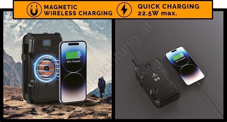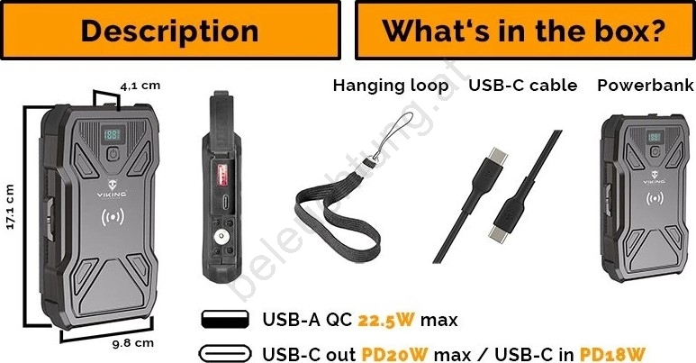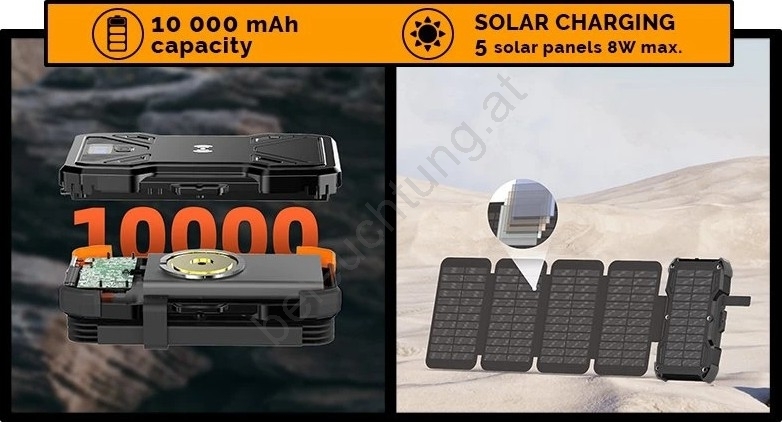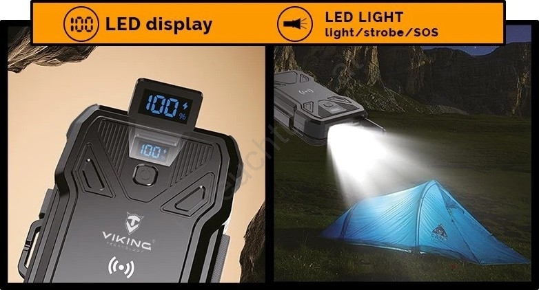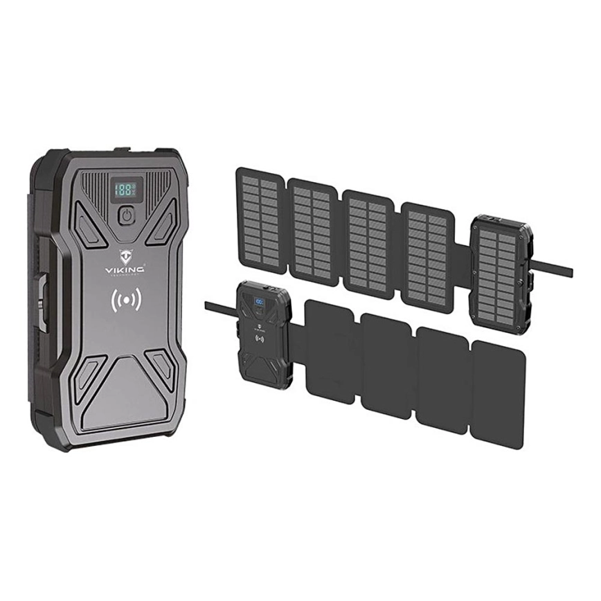Viking - Powerbank mit LED-Taschenlampe, kabellosem Laden und Solarpanel, Power Delivery 22,5 W / 10.000 mAh