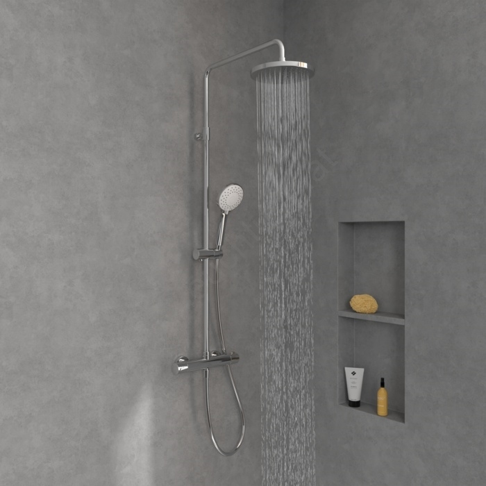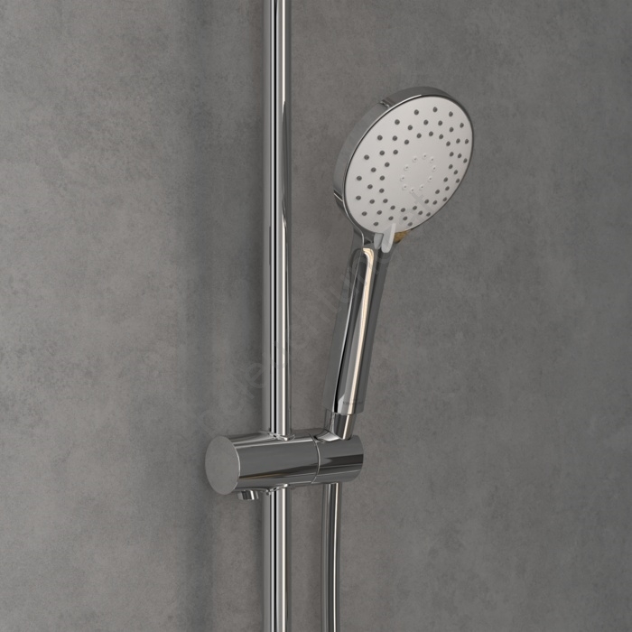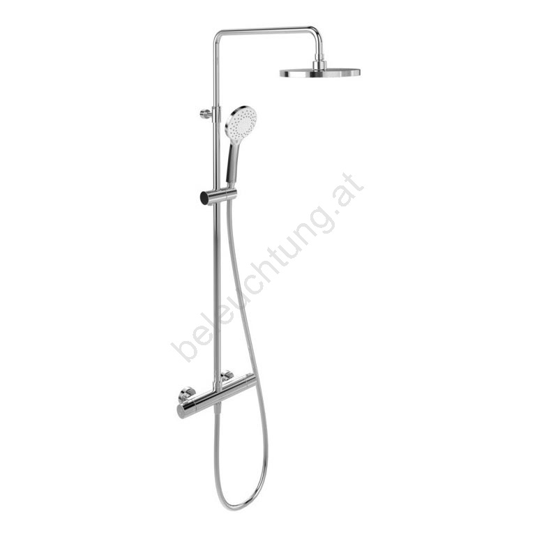 • Das Set enthält: Duschstange mit verschiebbarem Halter, Handbrause, Kopfbrause, Duschschlauch (150 cm), Brausearm für die Kopfbrause, Mischbatterie.