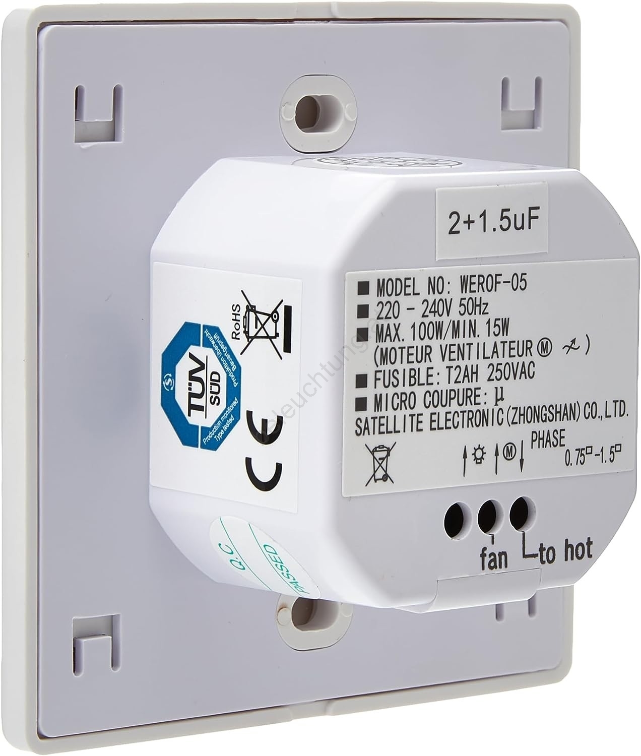 • Wandgeschwindigkeitsregler für Ventilatoren ohne Beleuchtung.