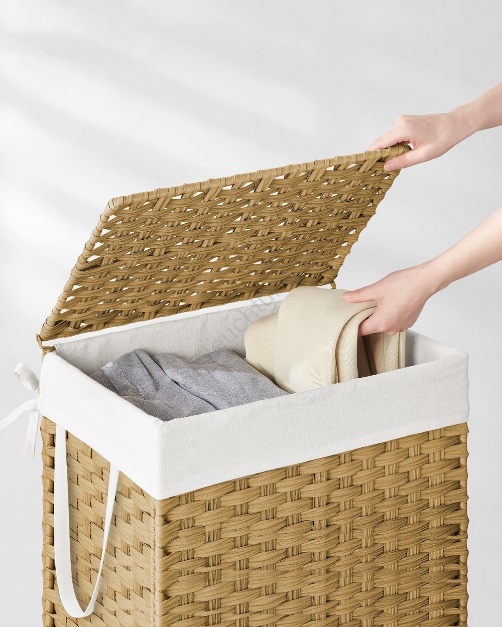 • Der Deckel lässt sich leicht öffnen und schließen, sodass Sie die Wäsche einfach abdecken können – der Deckel verhindert die Ausbreitung unangenehmer Gerüche und schützt die Wäsche vor Staub.