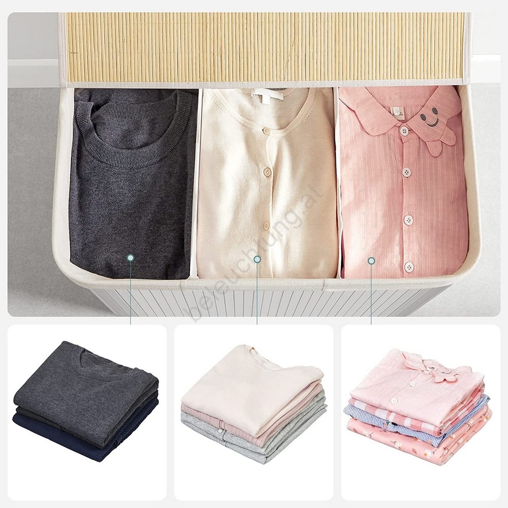 • Drei Fächer helfen Ihnen, Bettwäsche und Kleidung getrennt aufzubewahren oder die Wäsche nach Farben zu sortieren.