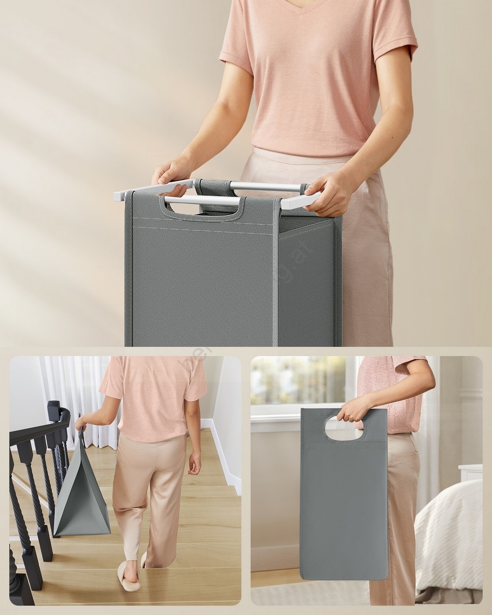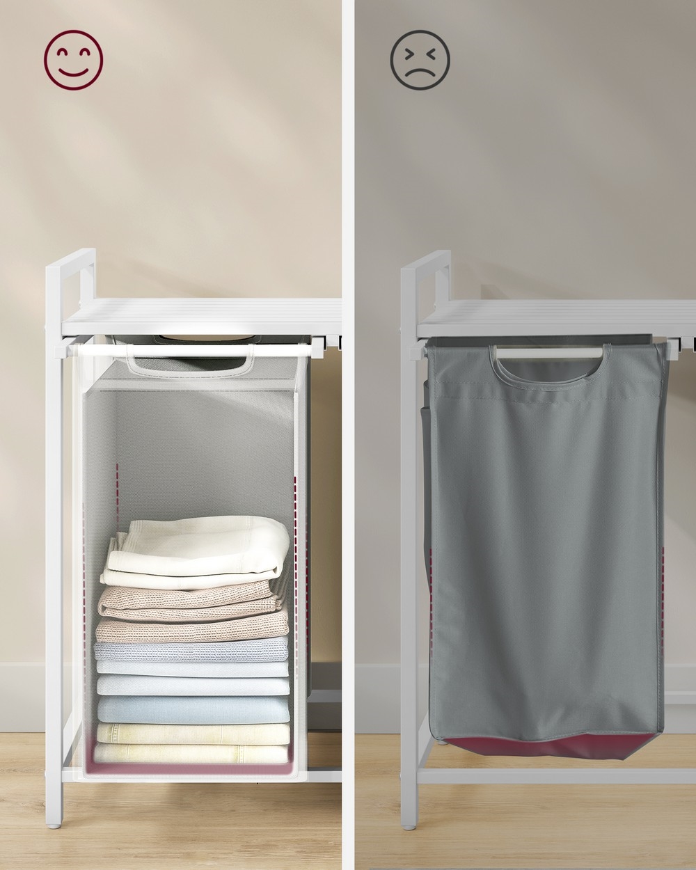 • 2 Beutel, 1 Ablage – Sortieren Sie Ihre Wäsche in zwei Stoffbeutel (46 l pro Beutel) und legen Sie Waschmittel, Weichspüler und weiteres Zubehör auf die Ablage.