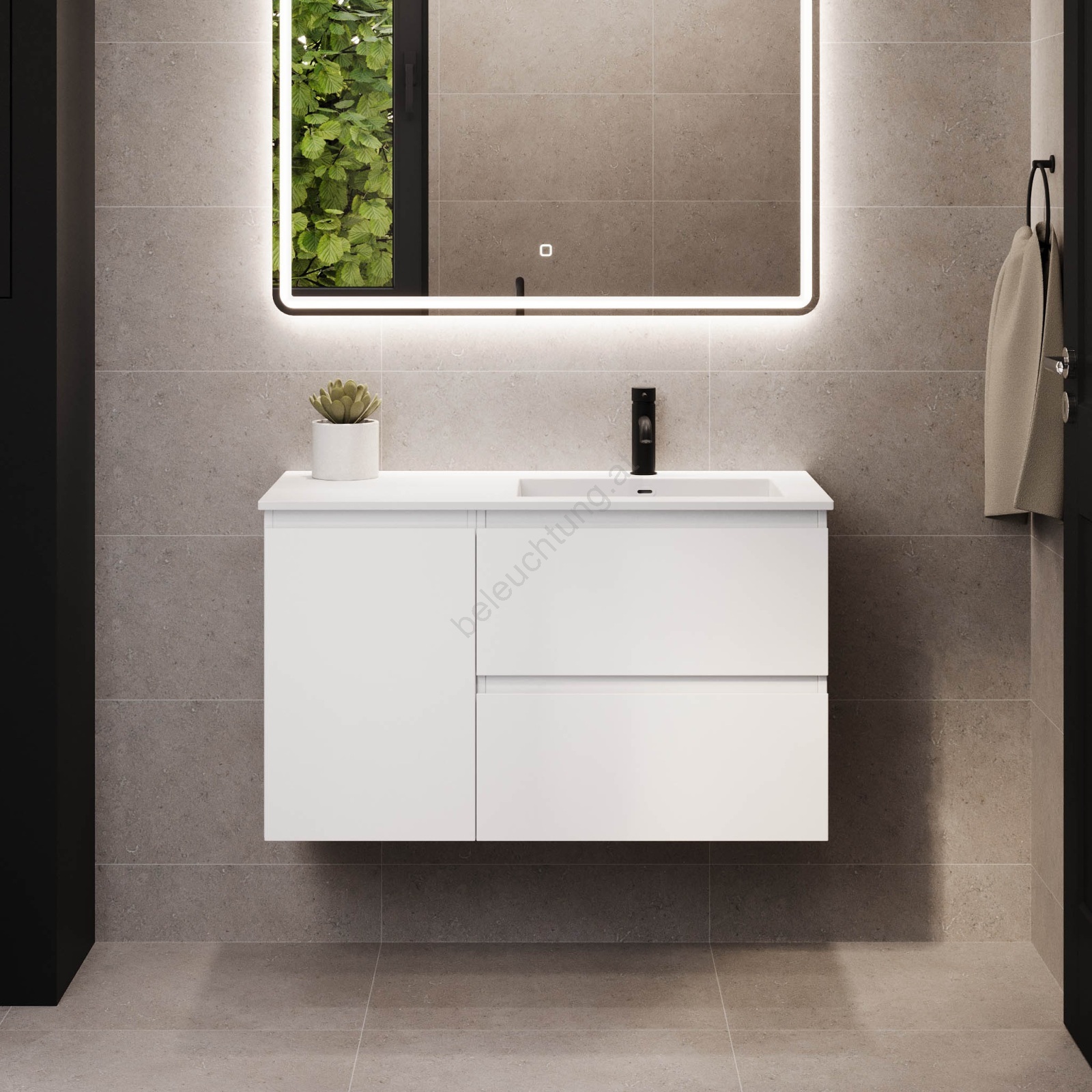 • Integrierte Griffe, dezent entlang der Vorderseite des Waschtischunterschranks angebracht.