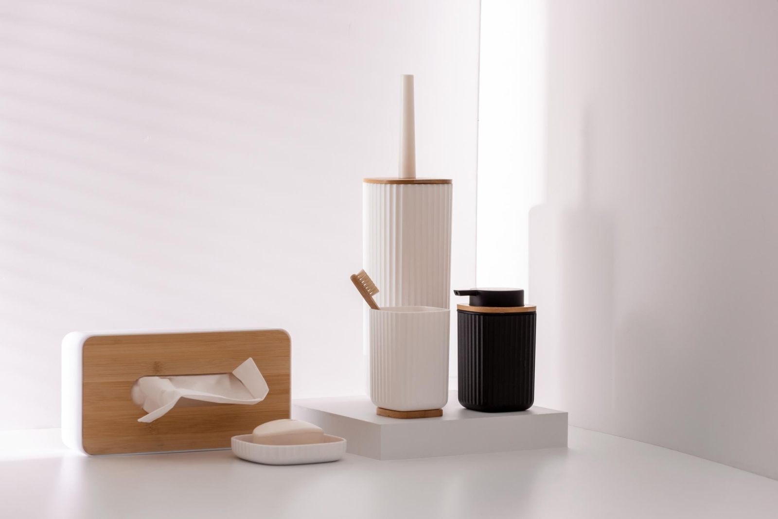 • Kombination aus schwarzem Kunststoff und einem natürlichen Bambusdetail am Deckel.