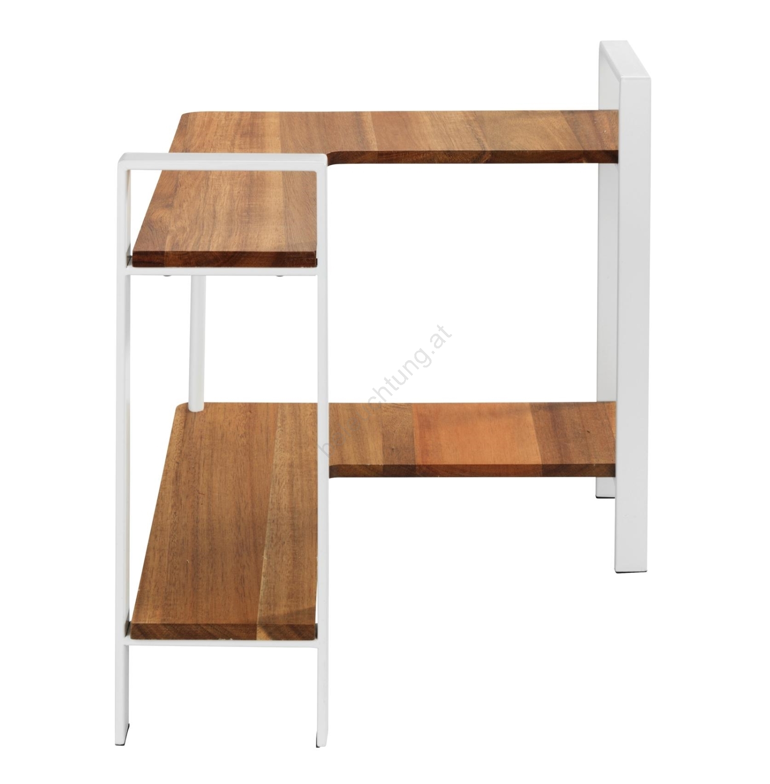 • Elegante Kombination aus weißem Metallrahmen und Ablagen aus Akazienholz.