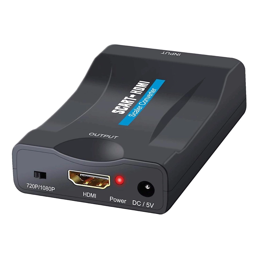 • Praktischer Scart-zu-HDMI-Konverter in Schwarz, der eine einfache Verbindung von Geräten mit Scart-Ausgang zu einem Fernseher (HDMI) ermöglicht.