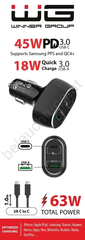 Winner Group - Autoladegerät 1xUSB-C + 1xUSB-A Power Delivery 63W + USB-Kabel USB-C / USB-C 1 m schwarz