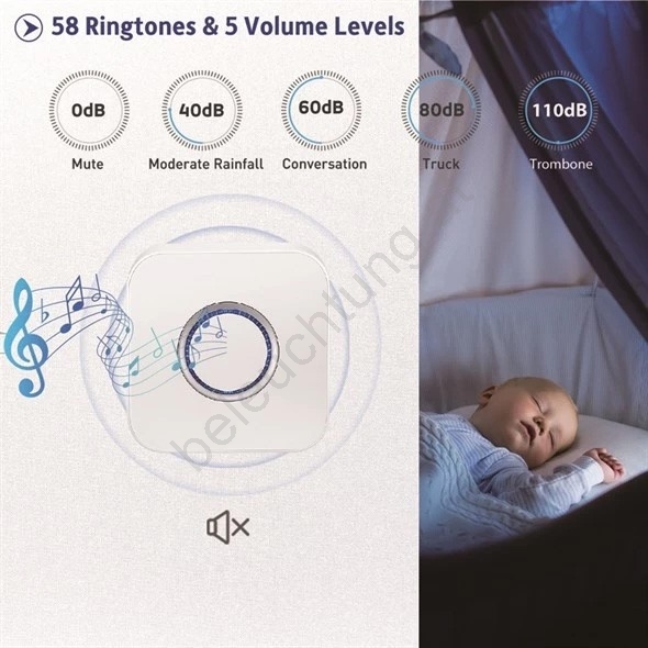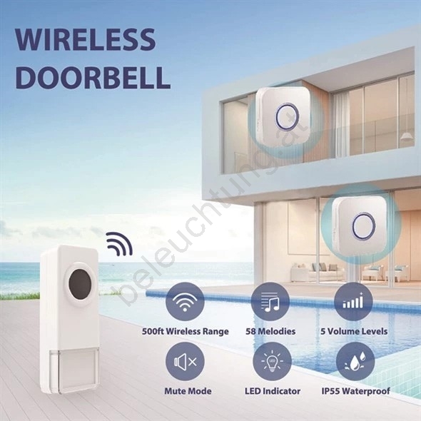 • Die Türklingel hat ein schlichtes, modernes Design, 5 Lautstärkestufen, eine Auswahl von 58 Klingeltönen und eine leichte Klingelanzeige.