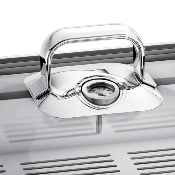 • Glasdeckel mit dichtem Silikonrand und integriertem Thermometer – hält den Dampf im Inneren und ermöglicht die Temperaturkontrolle.